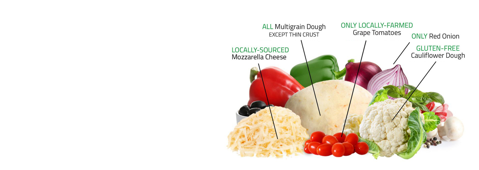 Our vegetables are picked farm fresh for Freshslice. Our tangy onions, vibrant green and red peppers to the perfect slice of mushroom. Pick from 11 options, even flame roasted corn!